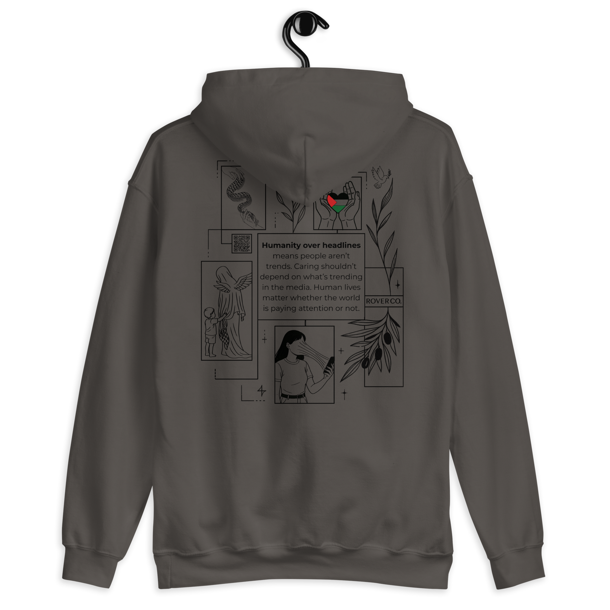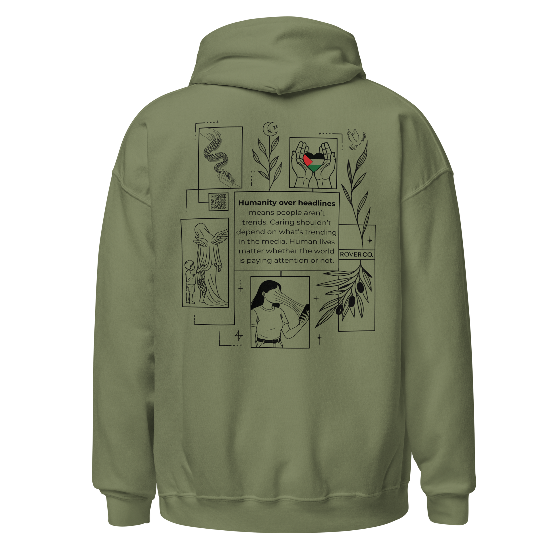 Humanity over Headlines Embroidery Unisex Hoodie – Palestine Supportive Heavy Blend Hoodie | Minimalist Embroidered Front + Meaningful Back Design (Sand, Charcoal, Military Green)