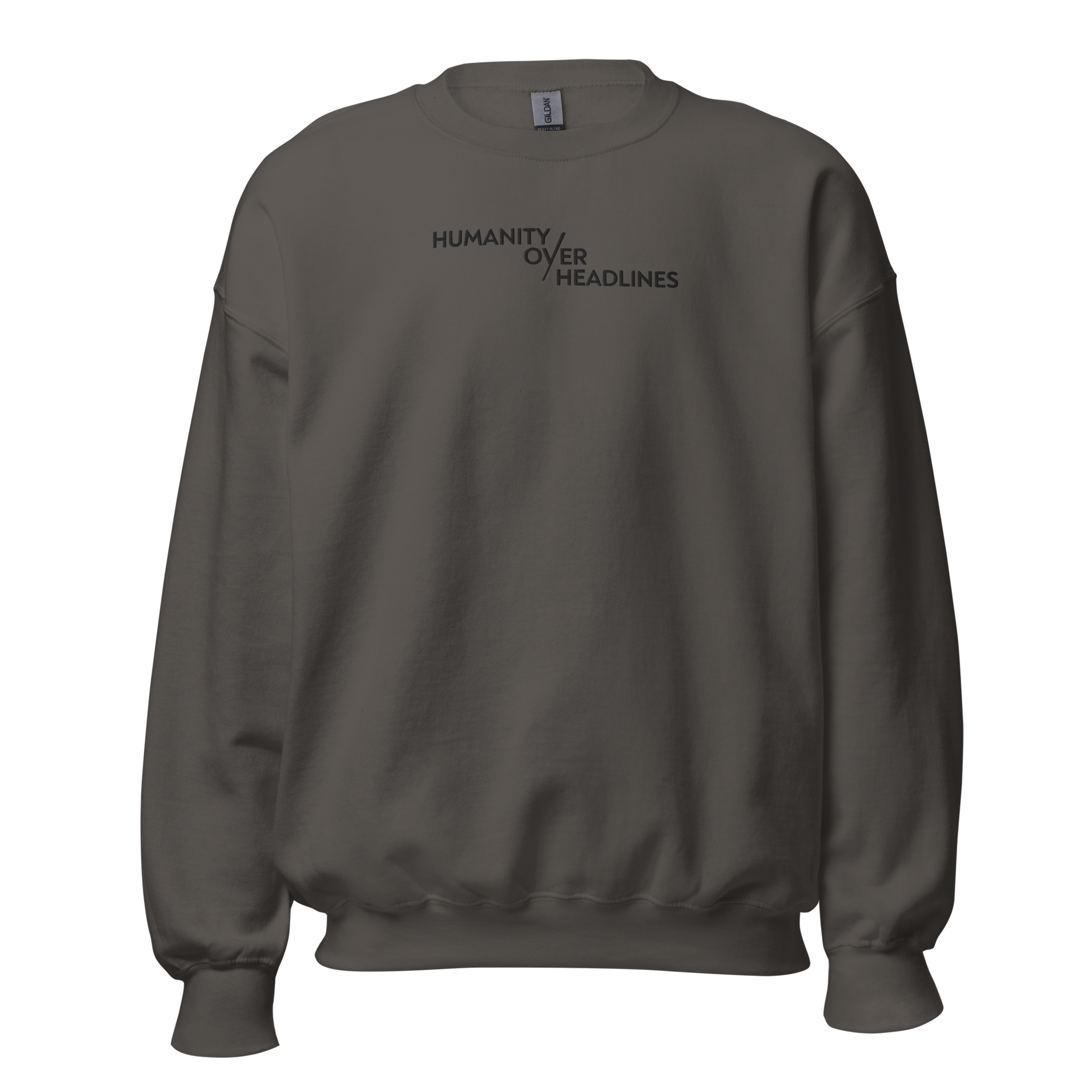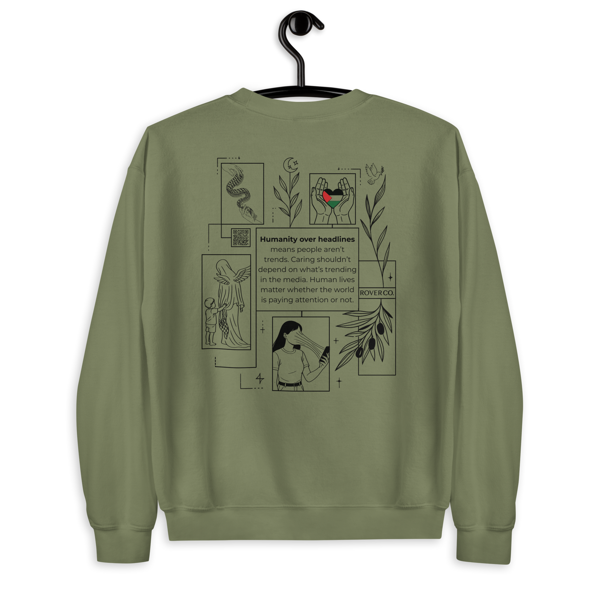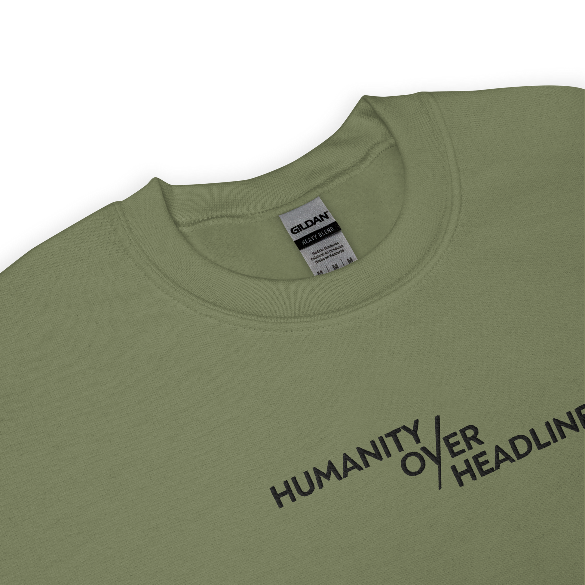 Humanity over Headlines Embroidery Unisex Sweatshirt | Embroidered Palestine Crewneck | Anxiety, Trauma & Safety Support Sweatshirt (Gildan 18000)