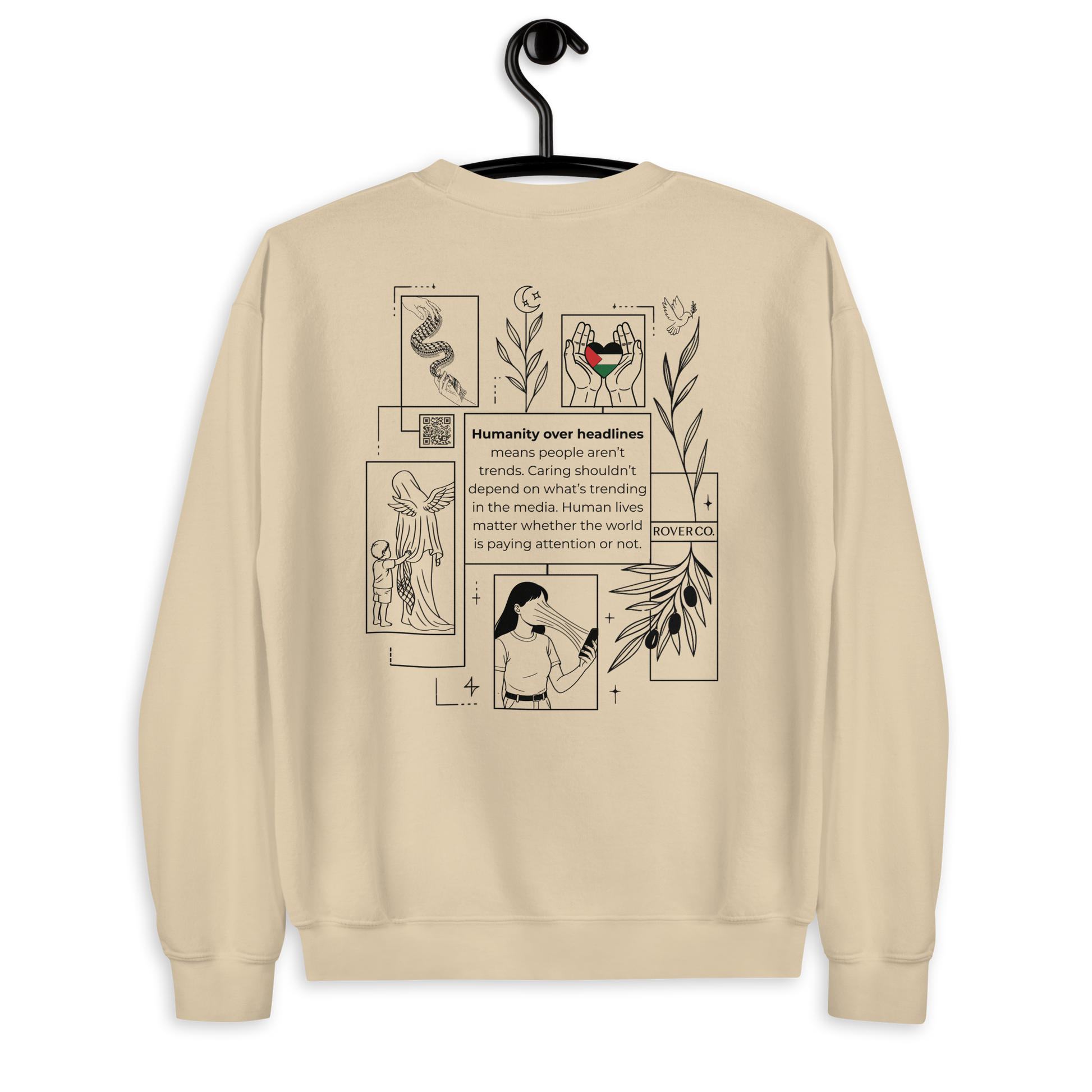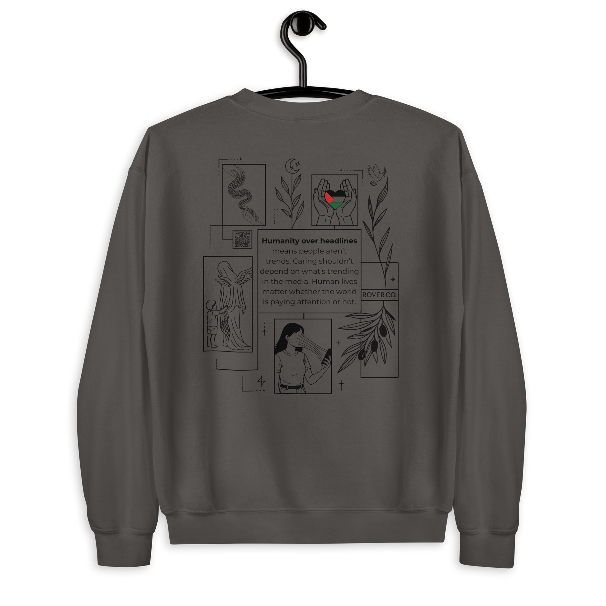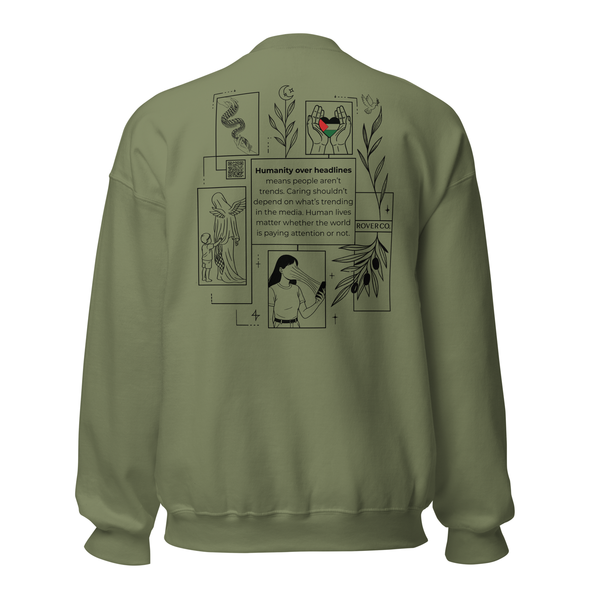 Humanity over Headlines Embroidery Unisex Sweatshirt | Embroidered Palestine Crewneck | Anxiety, Trauma & Safety Support Sweatshirt (Gildan 18000)